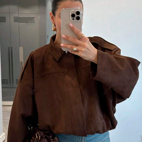 Su caída oversize y textura suave tipo gamuza elevan cualquier conjunto: jeans, vestido o pantalón sastre.